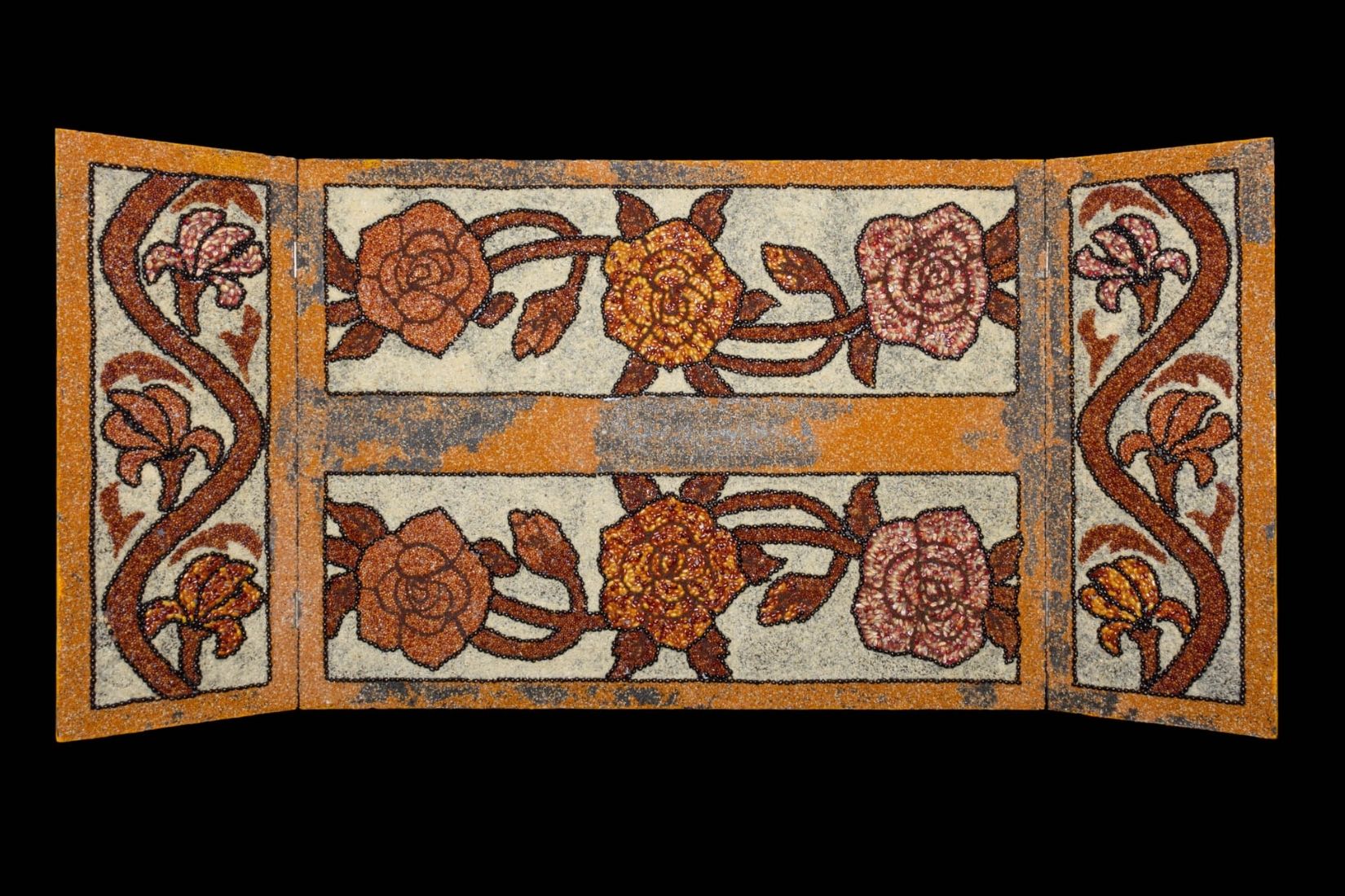 Biombo de semillas pegadas sobre madera. Artesano y procedencia desconocidos. Donante Zita Luz Autrey. Col. AmigosMAP. (Foto: EKV).