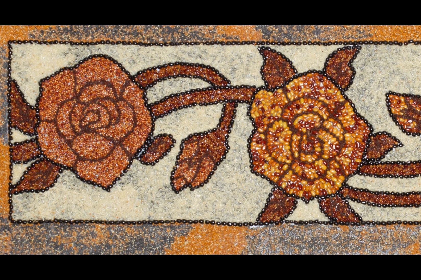 Detalle de biombo de semillas pegadas sobre madera. Artesano y procedencia desconocidos. Donante Zita Luz Autrey. Col. AmigosMAP. (Foto: EKV).