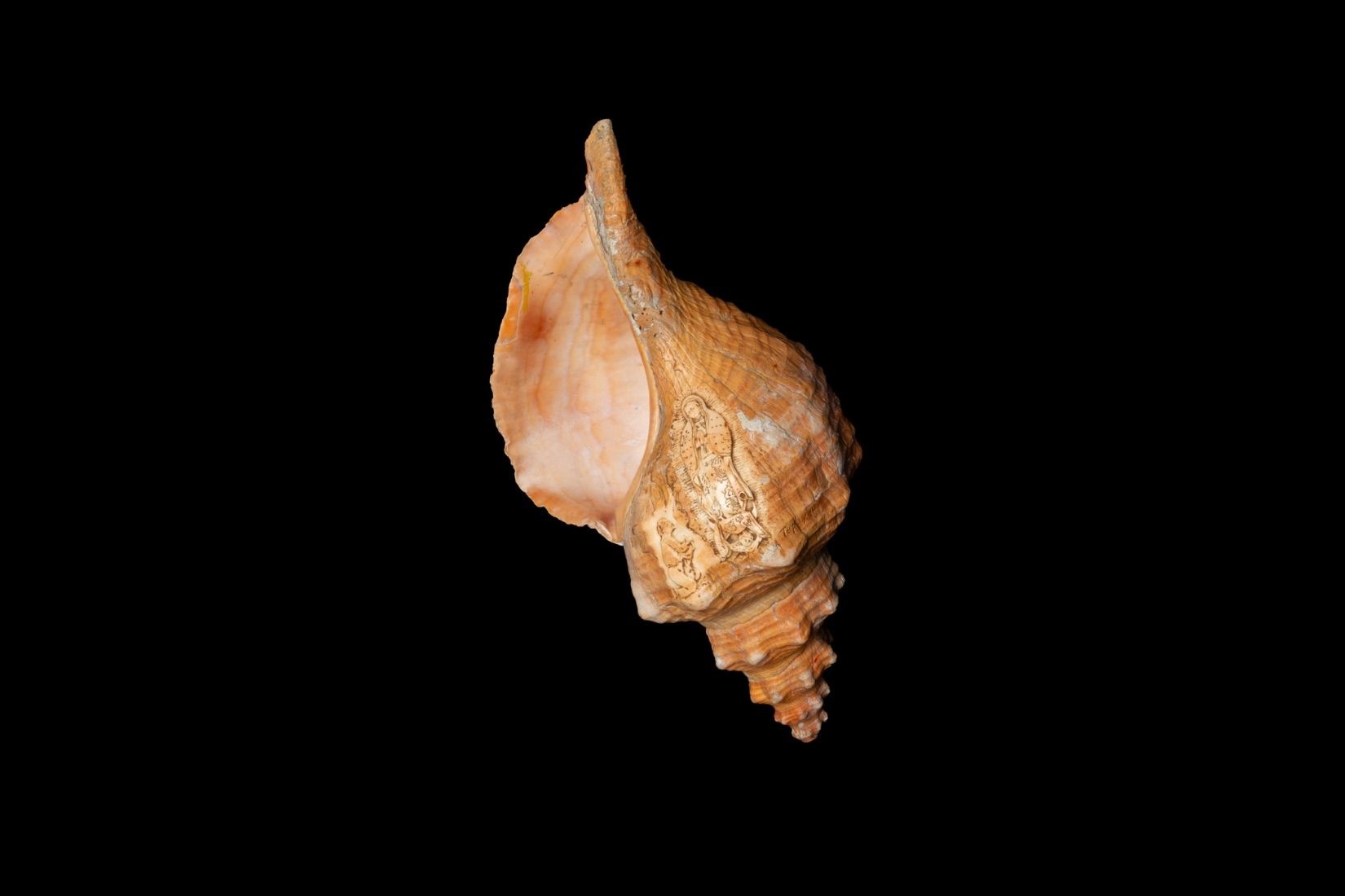 Caracol grabado con imagen de la Virgen de Guadalupe. Artesano y procedencia desconocidos. Col. Marie Thérèse Hermand de Arango. (FOTO: EKV).