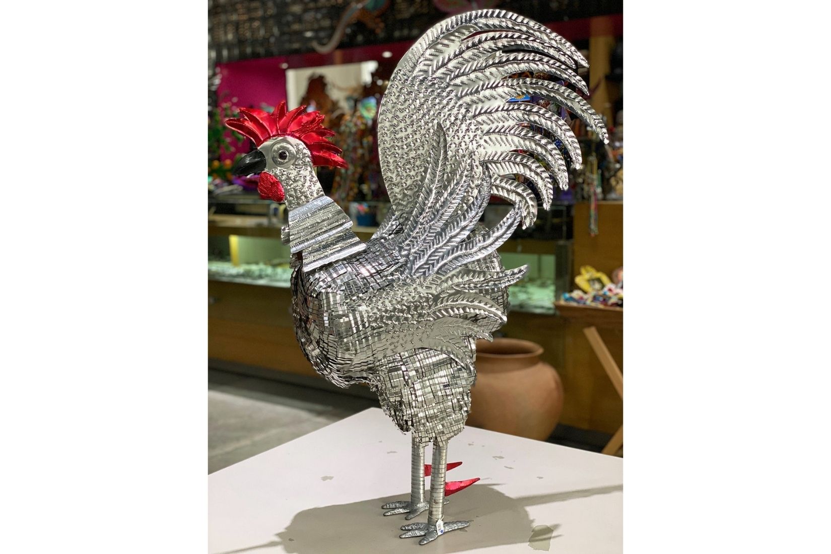Gallo de hojalata cincelada. Artesano Francisco Jáuregui. Guadalajara, Jal. Tienda MAP.