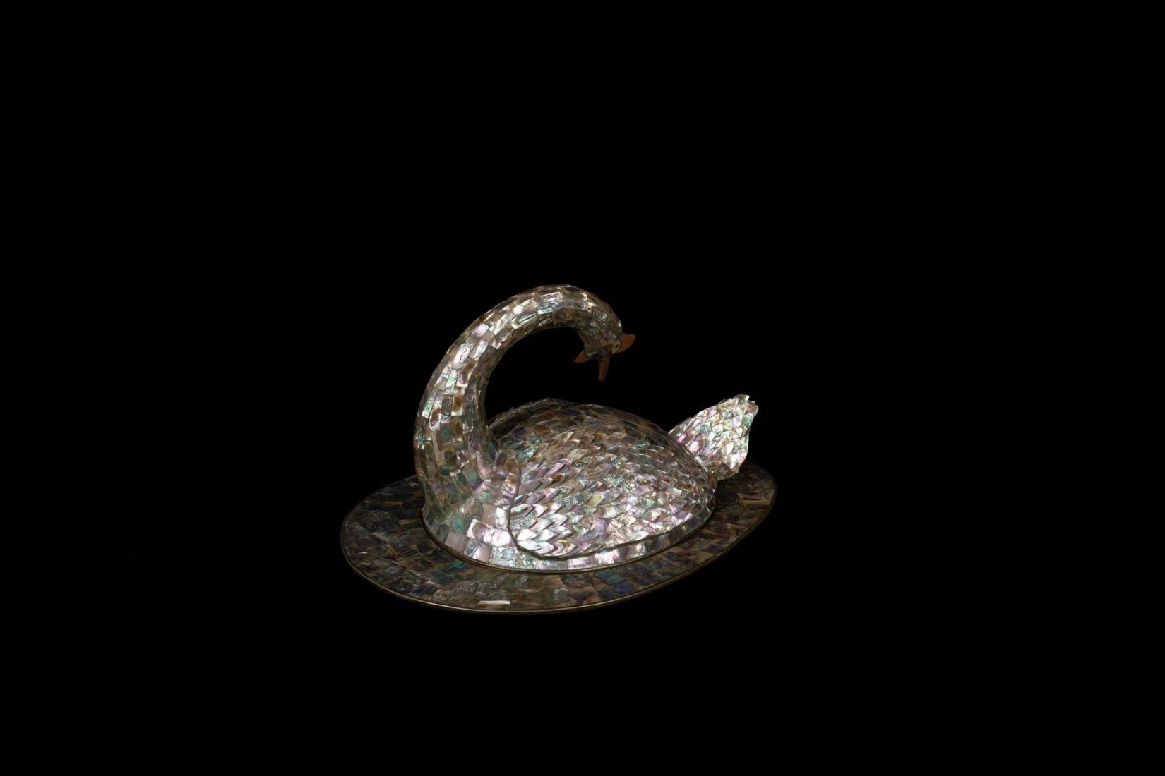 Charola con tapa en metal moldeado con aplicaciones de concha. Artesano y procedencia desconocidos. Col. Marie Thérèse Hermand de Arango. (Foto: EKV).