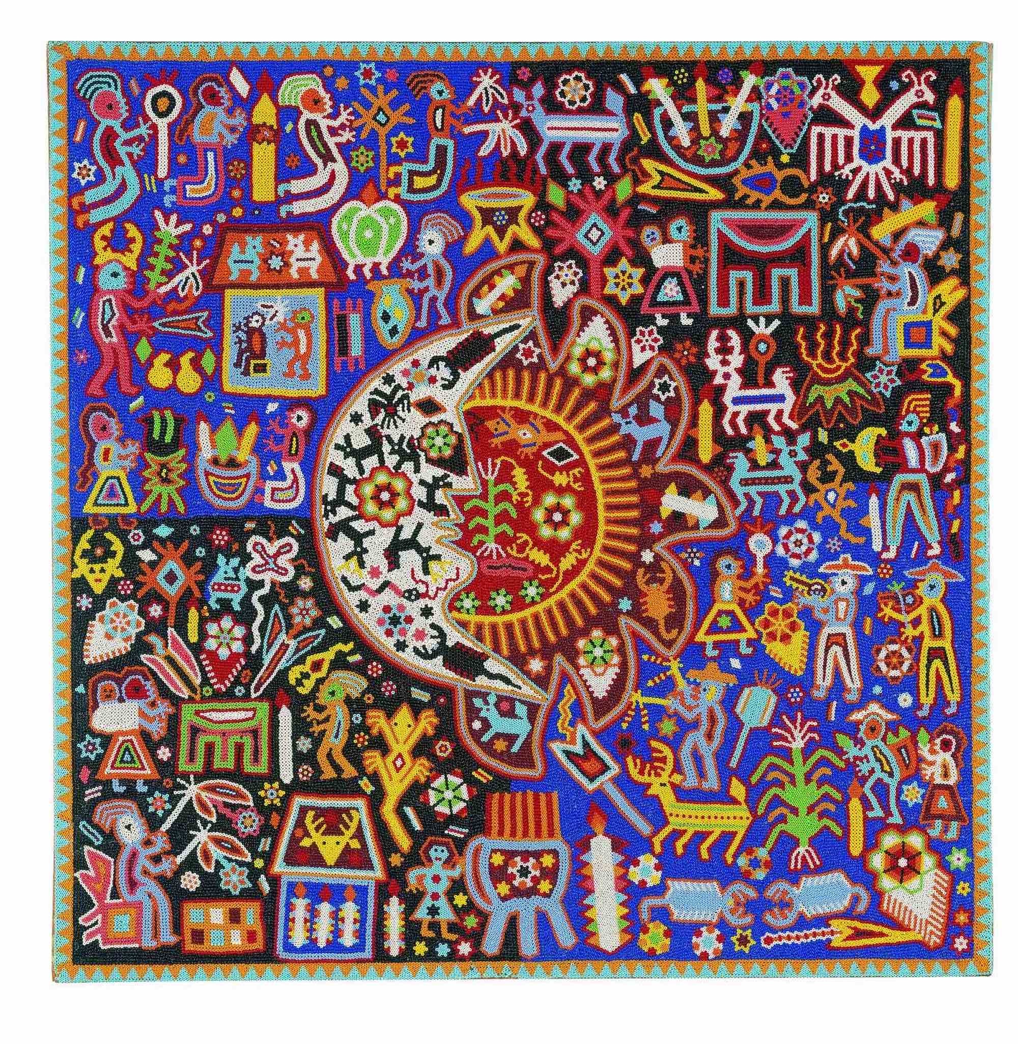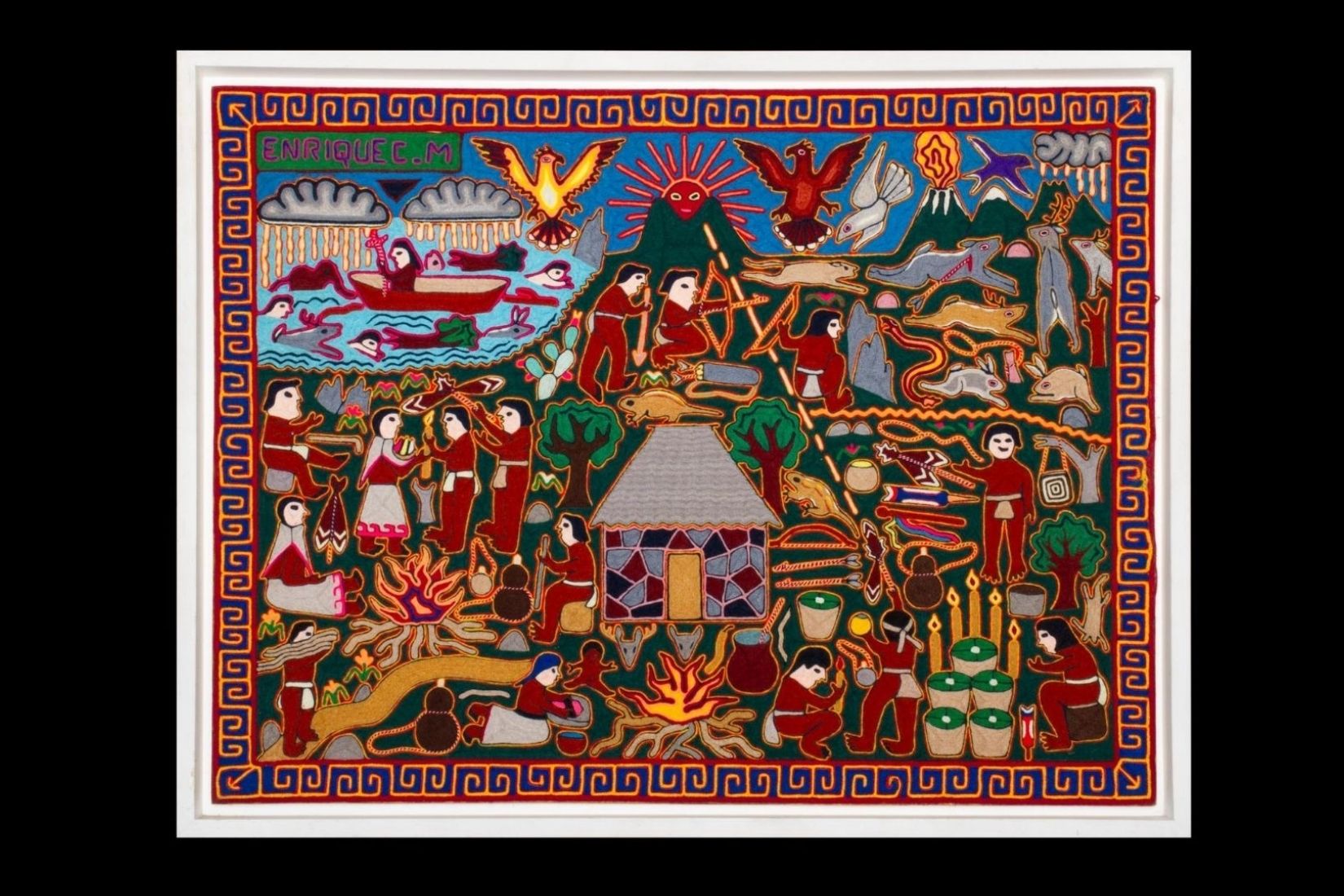 Tabla huichola con escena prehispánica. Estambre pegado en madera. Artesano Enrique Carrillo Montoya. San Andrés Cohamiata, Mizquitic, Jal. Col. Part. (Foto: EKV).