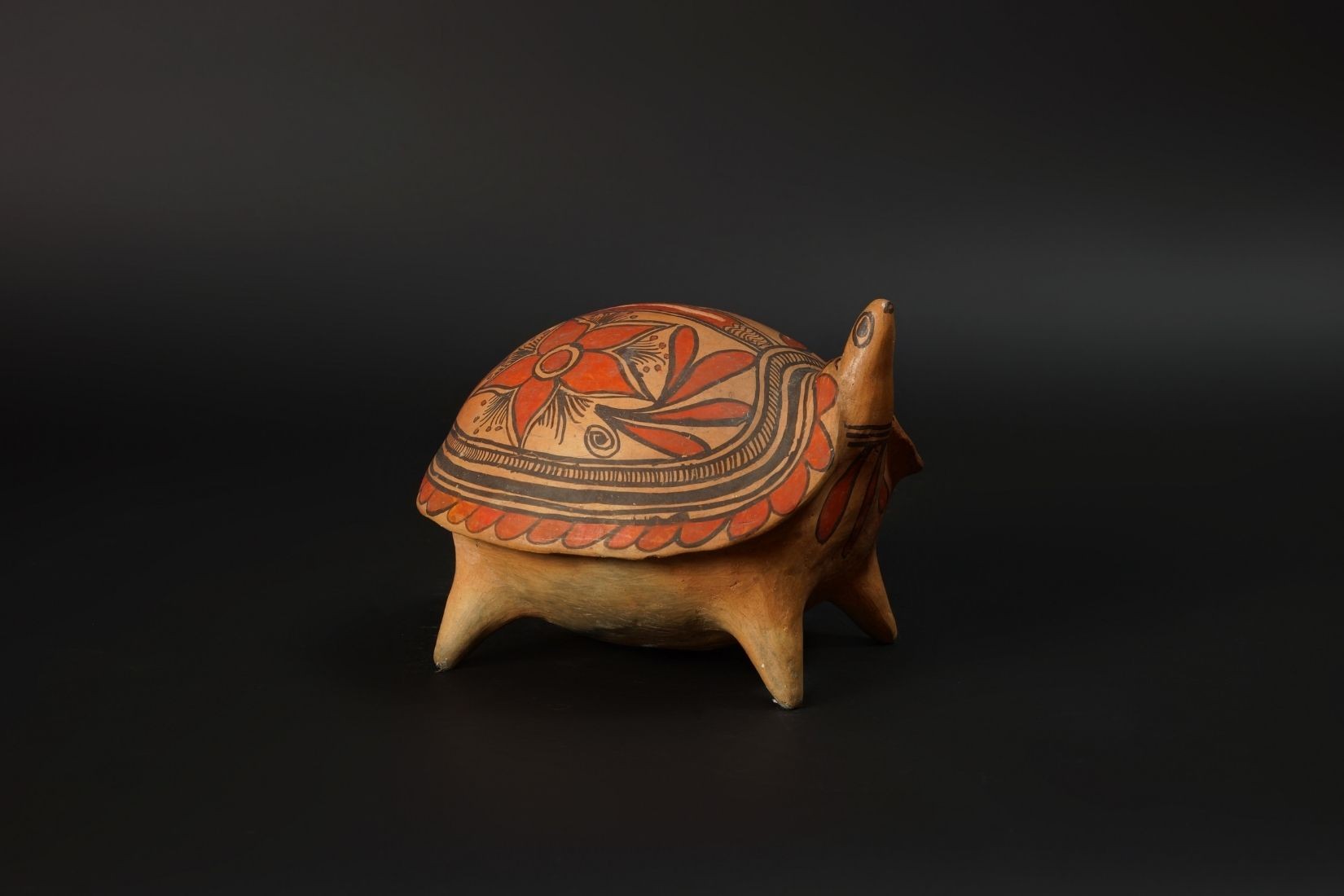 Tortuga de barro natural pintado con tierras de colores. Artesano desconocido. San Agustín Oapan, Gro. Col. Populart, pieza donada a AmigosMAP. (Foto: Jasso).