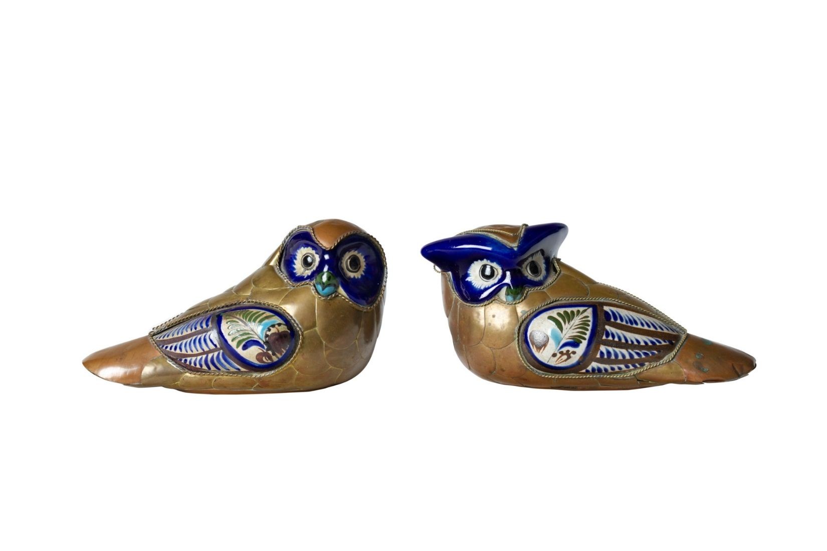 Búhos de latón moldeado con cerámica. Artesano y procedencia desconocidos. Col. Marie Thérèse Hermand de Arango. (Foto: EKV).