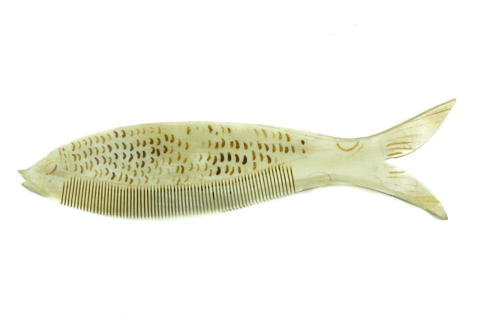Peine en forma de pescado en hueso recortado. Artesano y procedencia desconocidos. Col. Populart, pieza donada a AmigosMAP. (Foto: EKV).