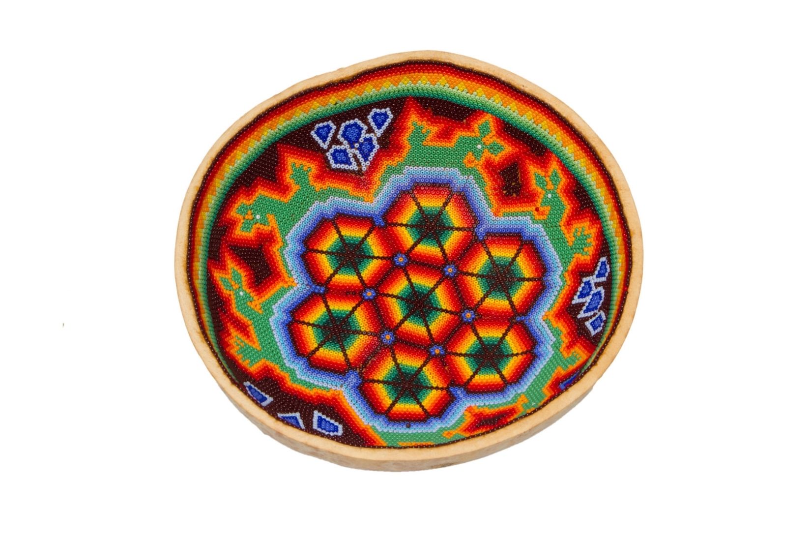 Jícara con peyotes. Aplicaciones de chaquira con cera de campeche (técnica huichola). Artesano Abel Camacho Basilio. CDMX. 2014. Col. MAP. (Foto: EKV).