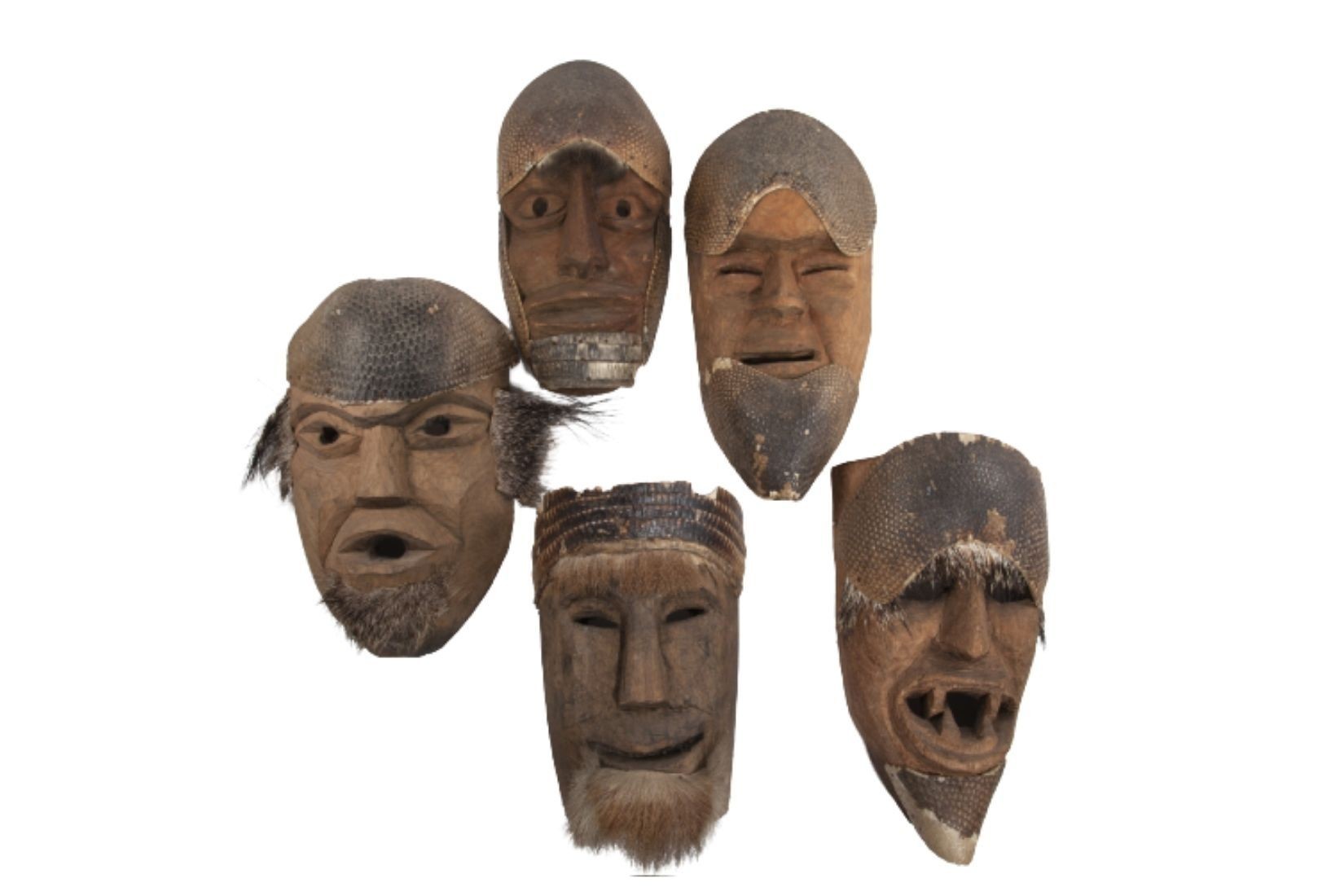 Máscaras de madera con aplicaciones de diversos materiales naturales. Col. Isak Kanarek.