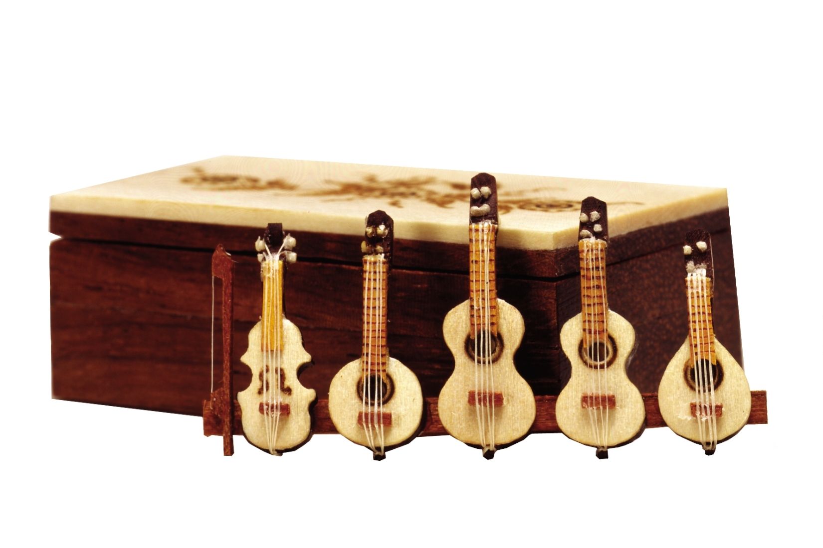 Estuche con instrumentos musicales en miniatura. Madera ensamblada y pirograbada. Artesano Venustiano Tenorio Reyes. Coicoyán, Oax. Donante Manuela Arango Hermand. Col. AmigosMAP. (Foto: Nicola Lorusso).