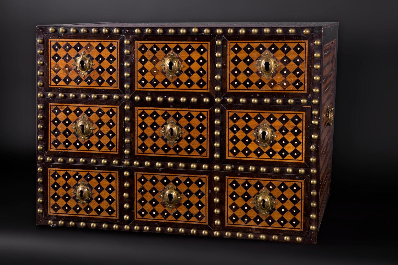 Cajonera antigua en madera taraceada. Autor y procedencia desconocidos. Col. Rodrigo Rivero Lake. (Foto: Jasso).