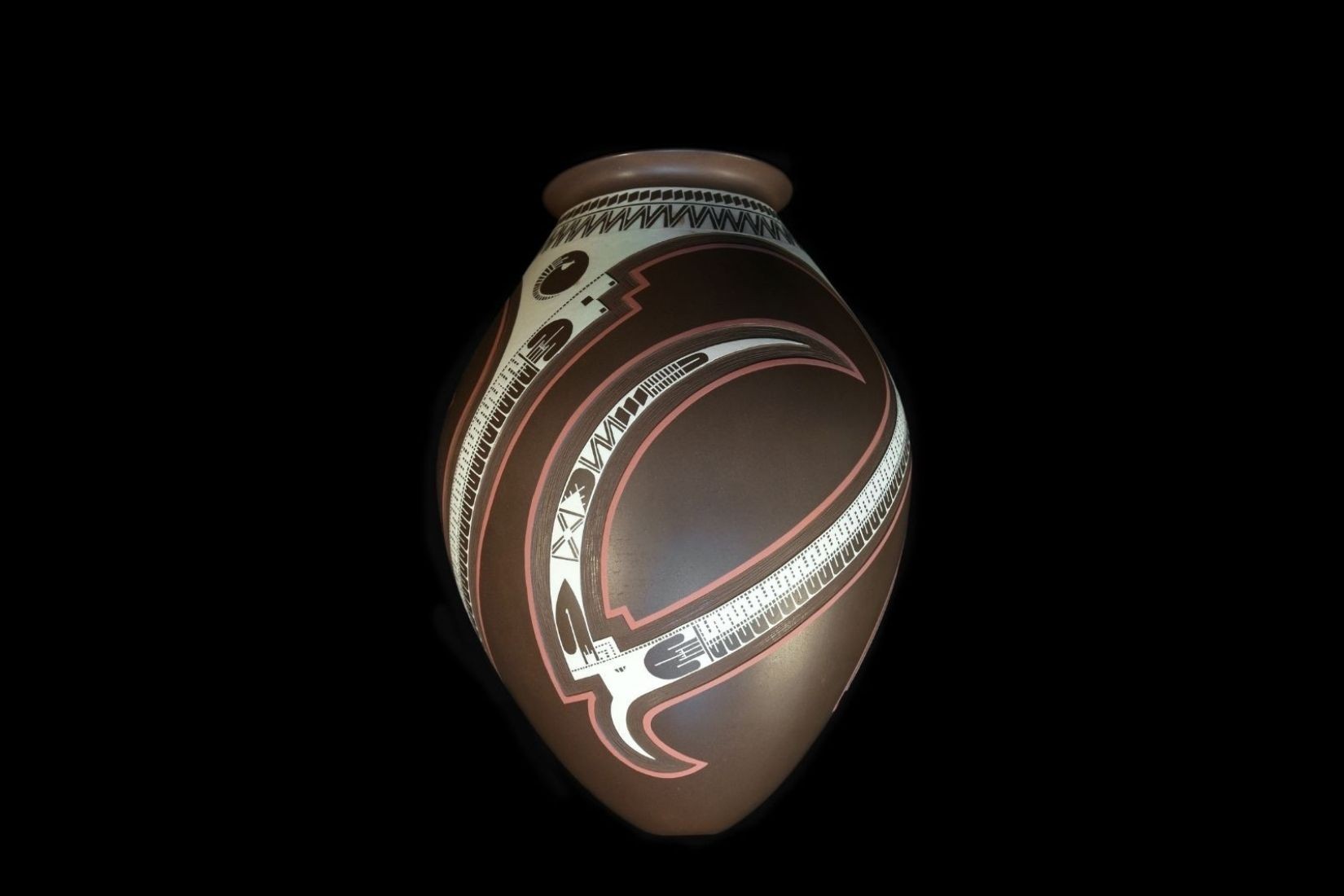 Cántaro de barro canelo bruñido y decorado con colores tierra. Artesano Nicasio Pajarito González. Tonalá. Jal. Col. Populart, pieza donada a AmigosMAP. (Foto: EKV).