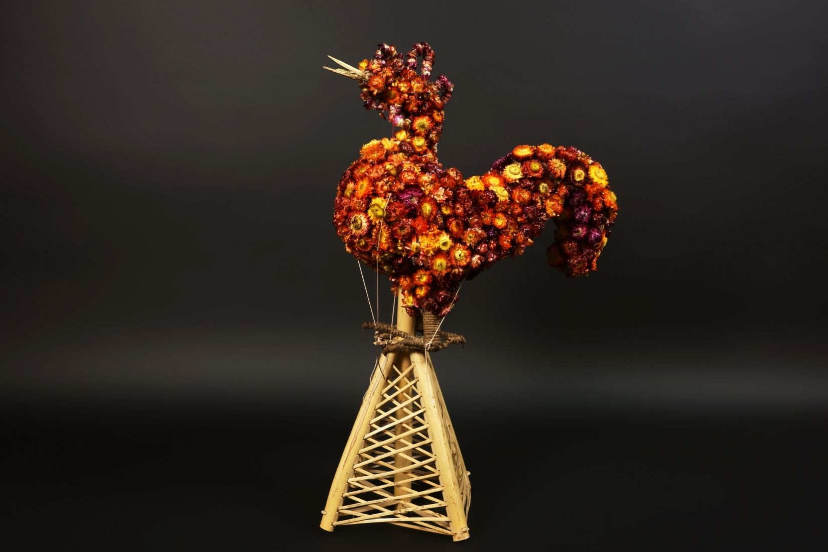 Gallo de flor inmortal (siempreviva) sobre carrizo. Artesana Francisca Lidia Sánchez Mateos. San Antonino, Oax. 2017. Col. MAP. (Foto: Jasso).