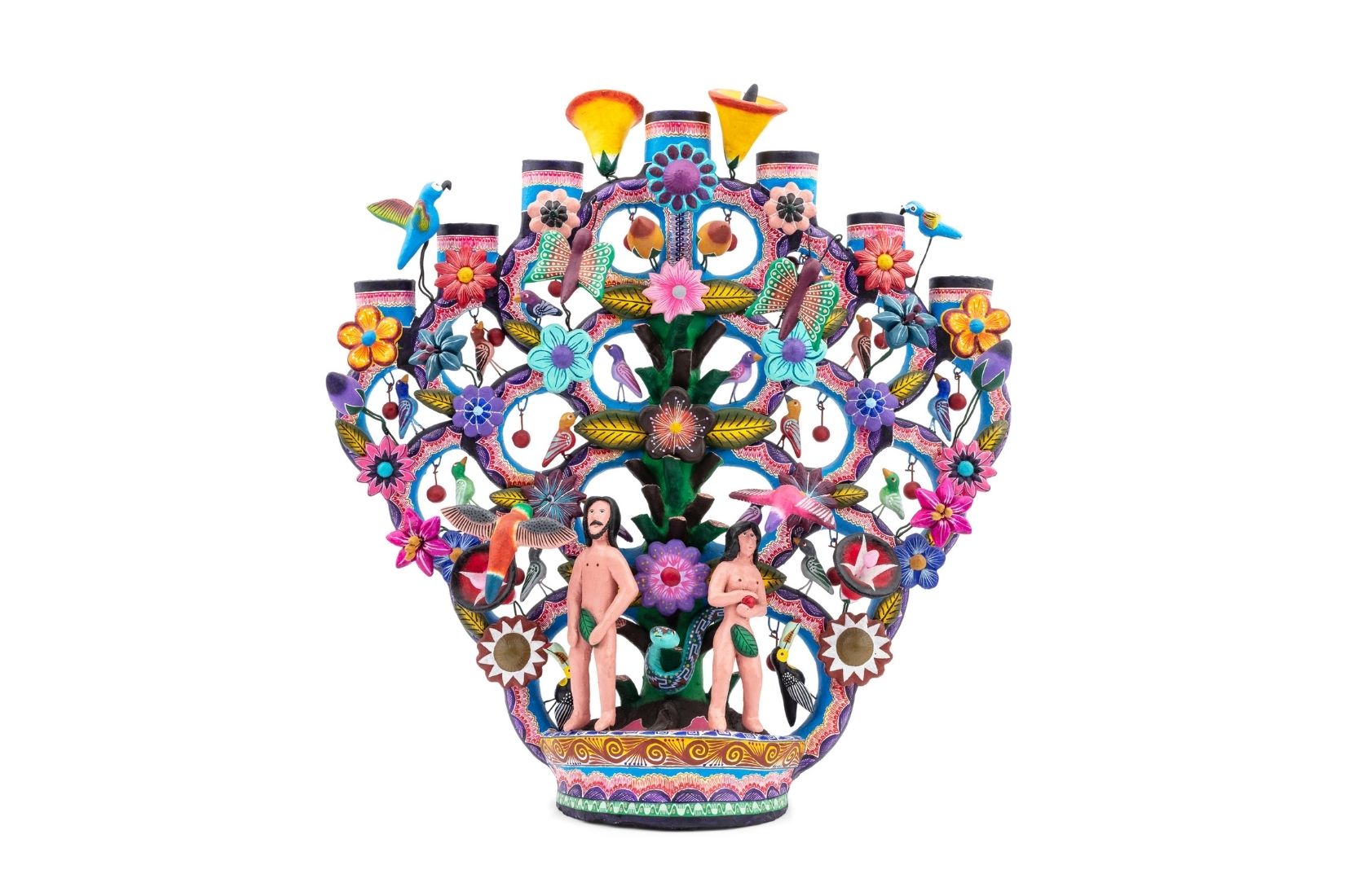 Adán y Eva. Árbol de la vida de barro modelado, policromado y pastillaje. Artesana María Balbuena Palacios. Izúcar de Matamoros, Pue. Col. Miguel Abruch. (Foto: GLR Estudio).