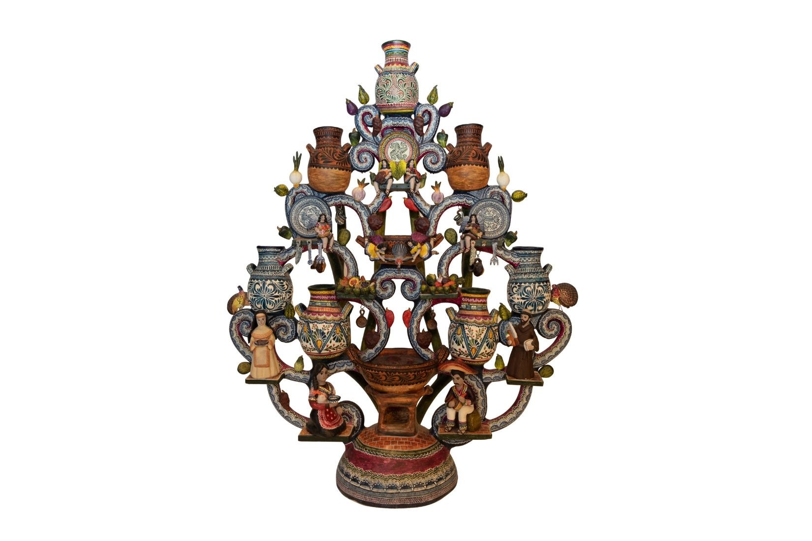 Historia del mole de guajolote y alfarería poblana. Árbol de la vida de barro policromado. Artesanos Martha Hernández y Alfonso Castillo Orta. Izúcar de Matamoros, Pue. Col. Part. (Foto: EKV).