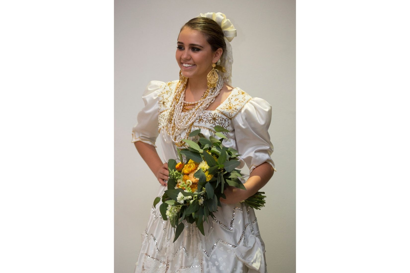 Silvia Rojo en traje de china poblana en Desfile Tres Generaciones en el MAP.