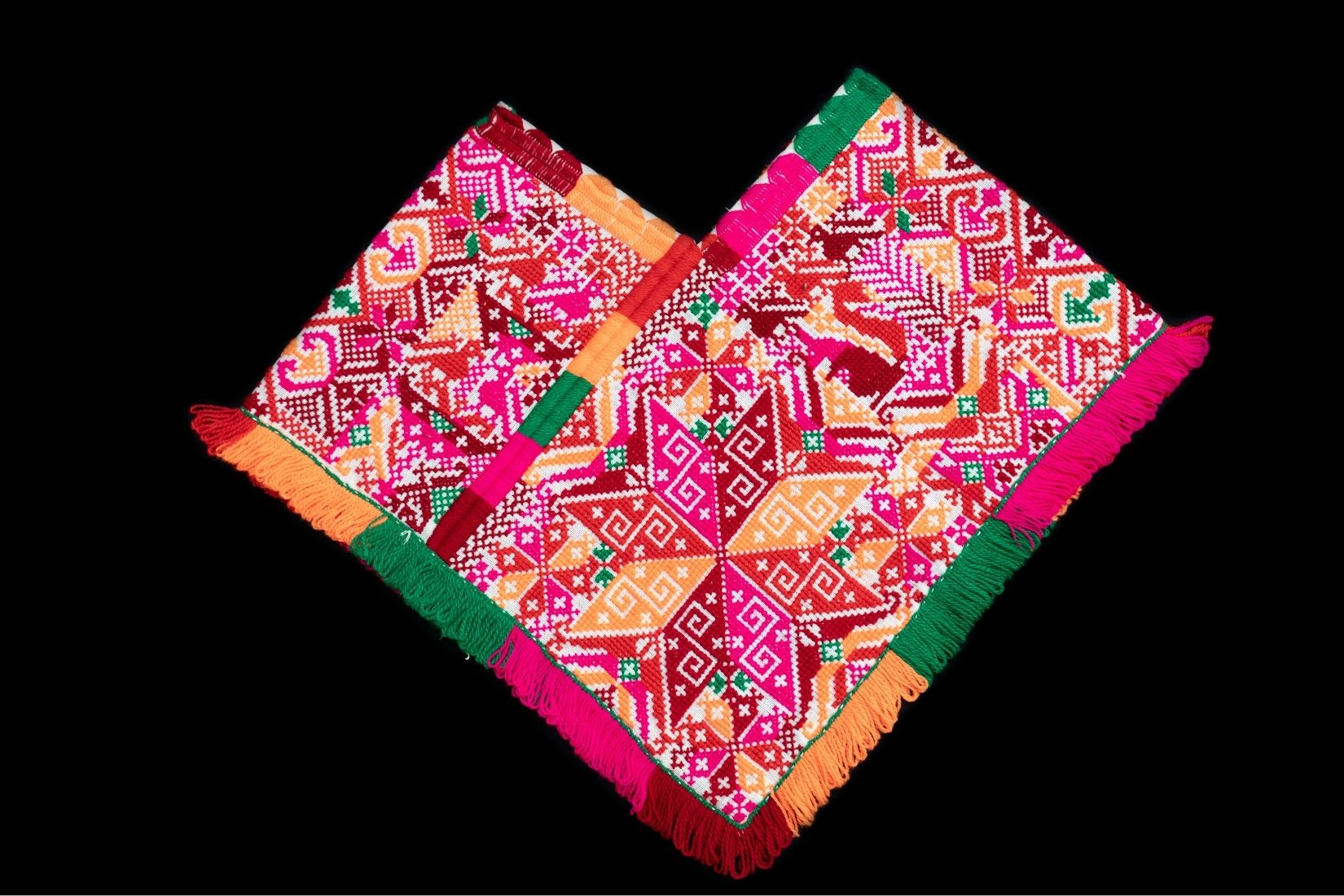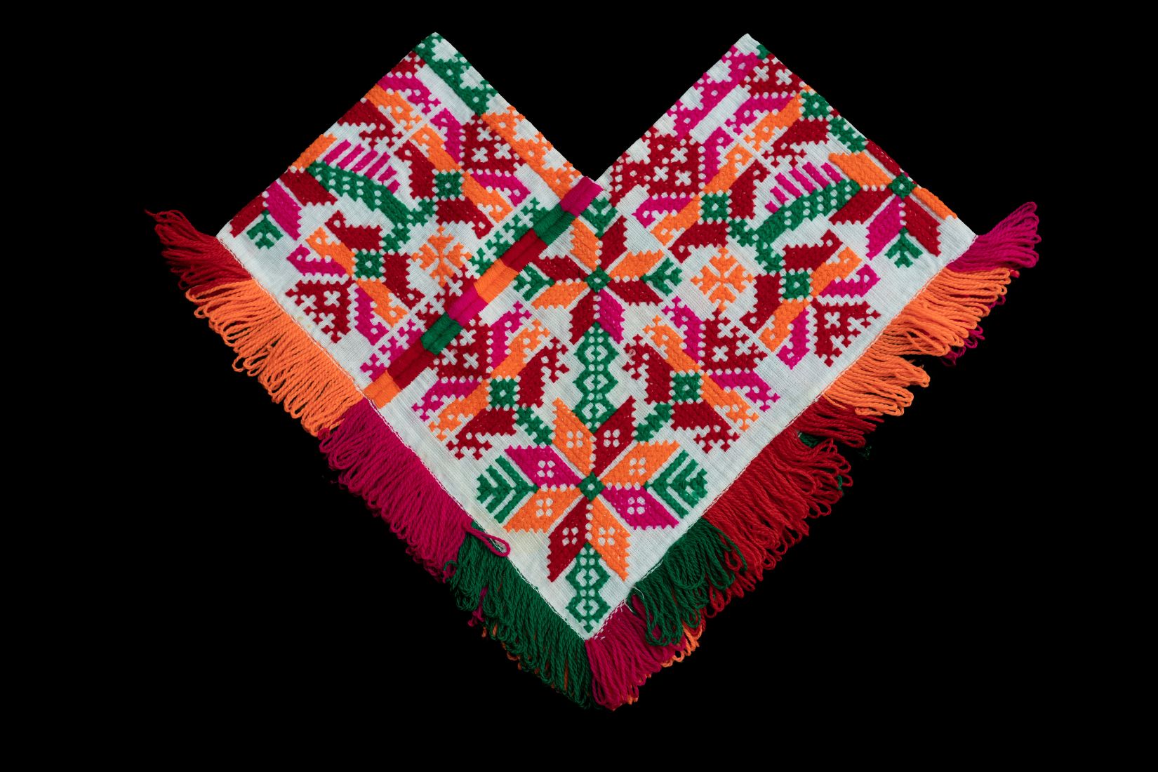 La piedra de toque del arte popular huasteco es el atuendo femenino tének, constituido en primer lugar por el quechquémetl, de raíces prehispánicas, bordado en intensos colores rojo, naranja, verde y guinda. “En su tejido se aprecia la estrella o flor de la vida y de la fertilidad, íntimamente ligada al ciclo del maíz y a las estaciones del año”; sus extremos representan los equinoccios y solsticios.