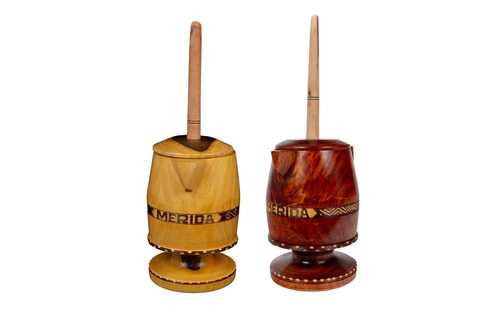 Chocolateras de madera tallada, torneada y entintada. Artesano desconocido. Mérida, Yuc. Donante Raúl Cásares Valdes. Col. AmigosMAP. (Foto: EKV).