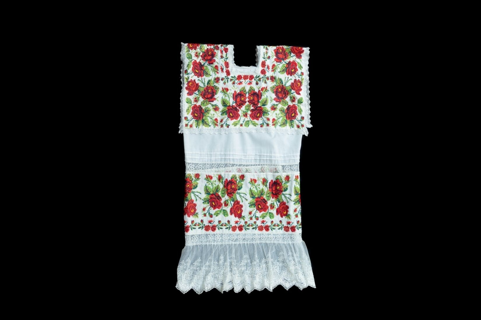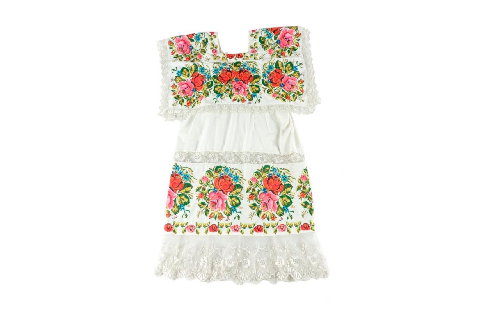 Terno bordado en tela de popelina y tul bordado con hilo de algodón en punto de cruz. Artesana Belem Segura Aguilar. Timucuy, Yuc. 1997. Col. Part. (Foto: EKV).
